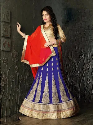 Embroidered Blue color Lehnga Kali with Red color Dupatta and Brocade Blouse